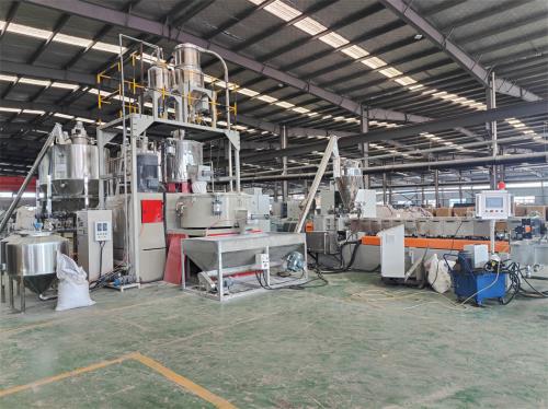 Ⅱ、造粒工藝:(500升高混機(jī)------螺旋上料機(jī))客戶自備-----雙螺桿計量式喂料——-JDL-75D雙螺桿擠出機(jī)------液壓板式換網(wǎng)——--液壓柱式排料裝置------水下切模頭------水泵------15米不銹鋼冷卻水管-----離心脫水機(jī)------2.5米加長振動篩----一級旋風(fēng)分離器-----風(fēng)冷成品料倉----采用:PLC控制